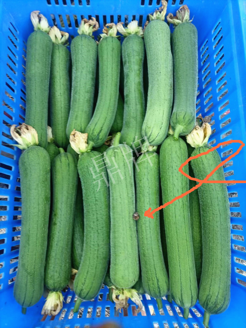 ▲ 裝入框中的“優(yōu)比1號”絲瓜。請看紅箭頭…