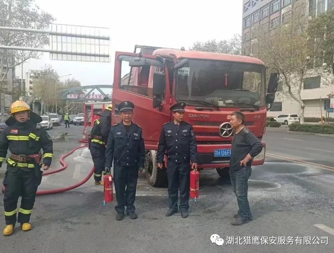 面對突如其來的變故,貨車司機(jī)緊急停車,下來時(shí)由于過度緊張,以至于重重摔倒在地,當(dāng)時(shí)司機(jī)疼痛難忍,更不知何滅火。危急關(guān)頭,我公司駐荊楚理工學(xué)院東門的保安員金鵬程(男,55歲,中共黨員,荊門城區(qū)人)和趙兵(男,55歲,漳河新區(qū)人)發(fā)現(xiàn)險(xiǎn)情后,迅速從值班室提起滅火器沖向著火的貨車,一左一右對準(zhǔn)起火部位進(jìn)行噴射滅火。