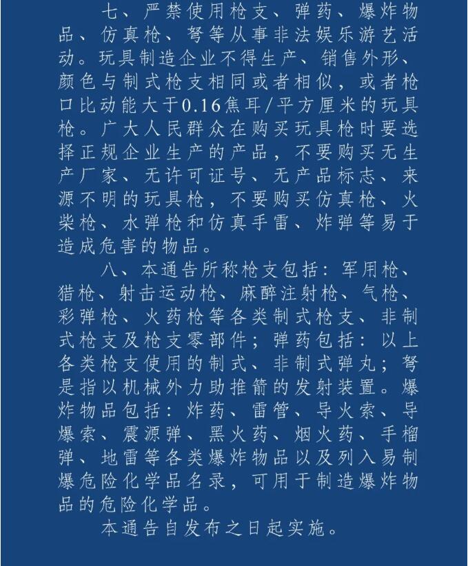 八、本通告所稱槍支包括:軍用槍、獵槍、射擊運動槍、麻醉注射槍、氣槍、彩彈槍、火藥槍等各類制式槍支、非制式槍支及槍支零部件;彈藥包括:以上各類槍支使用的制式、非制式彈丸;弩是指以機械外力助推箭的發(fā)射裝置。爆炸物品包括:炸藥、雷管、導(dǎo)火索、導(dǎo)爆索、震源彈、黑火藥、煙火藥、手榴彈、地雷等各類爆炸物品以及列入易制爆危險化學(xué)品名錄,可用于制造爆炸物品的危險化學(xué)品。