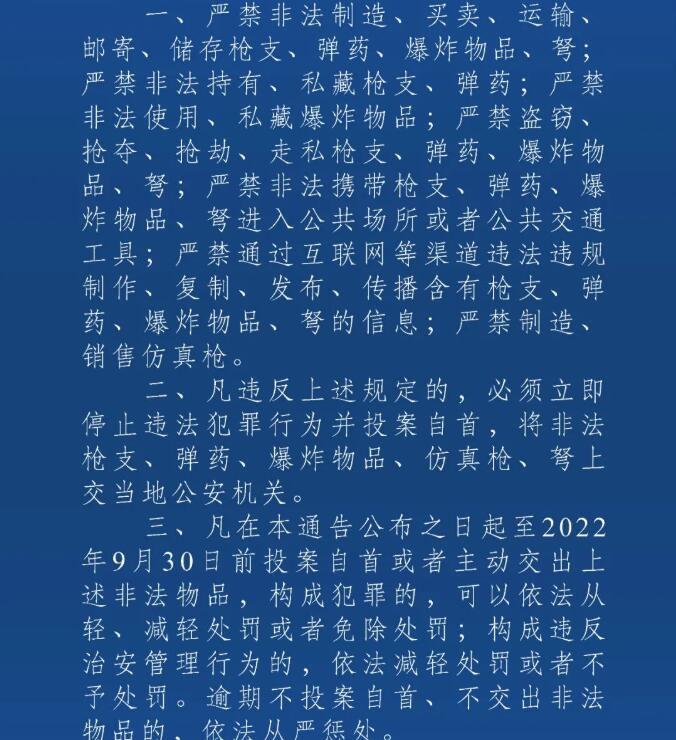 三、凡在本通告公布之日起至2022年9月30日前投案自首或者主動交出上述非法物品,構(gòu)成犯罪的,可以依法從輕、**處罰或者免除處罰;構(gòu)成違反治安管理行為的,依法**處罰或者不予處罰。逾期不投案自首、不交出非法物品的,依法從嚴(yán)懲處。