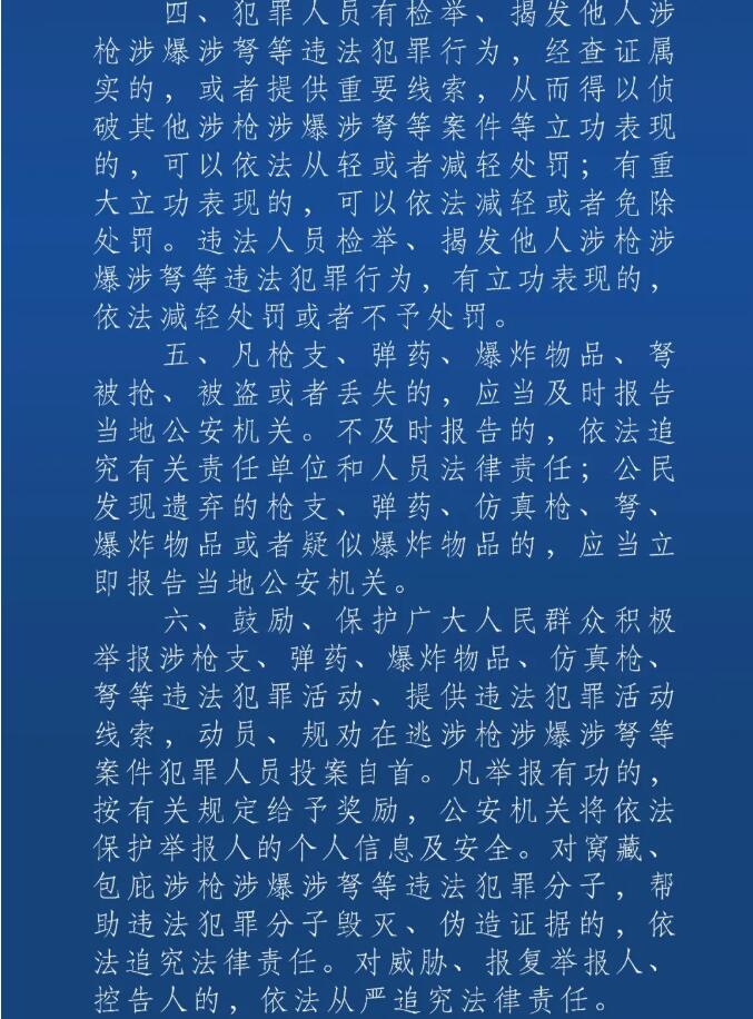 二、凡違反上述規(guī)定的,必須立即停止違法犯罪行為并投案自首,將非法槍支、彈藥、爆炸物品、仿真槍、弩上交當(dāng)?shù)毓矙C關(guān)。