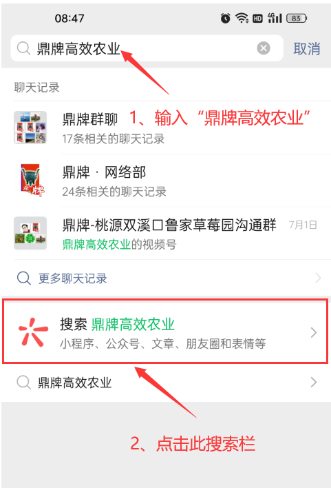 2、在輸入框輸入“鼎牌高效農(nóng)業(yè)”,下方會出現(xiàn)“搜索欄”,點(diǎn)擊搜索。